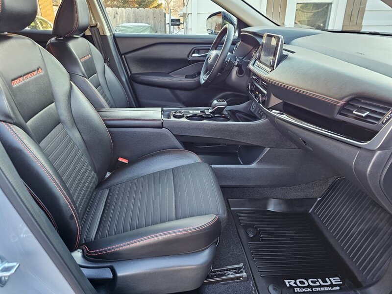 This AWD 2025 Nissan Rogue Rock Creek is equipped with off-road-tuned suspension, tubular roof rack with crossbars, hill descent control, water-repellent synthetic leather upholstery, heated front seats, off-road camera view, remote engine start, blind spot monitoring and rear cross-traffic alert, forward collision mitigation, rear automatic emergency braking, lane departure warning and assist, adaptive cruise control, 360-degree surround view camera system with rear parking sensors, 8-inch touchscreen, USB audio input and charging ports, Bluetooth, satellite radio, voice control, Apple CarPlay and Android Auto smartphone integration, two rear USB charging ports, audio controls on the steering wheel, multiple driving modes, power driver seat with power lumbar, push button start, power windows and locks, dual-zone climate control, heated power mirrors with turn signal, remote keyless entry, 17-inch alloy wheels, power liftgate, and more. Clean CARFAX. Fully inspected and serviced. Covered under remaining Nissan 5-year/60K-mile Powertrain Warranty. This Rogue is sporty with excellent road manners. And it's good looking too! Print this page and call us Now... We know you will enjoy your test drive towards ownership!